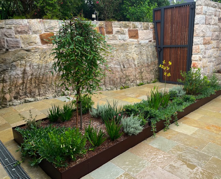 Katie helped me with a tricky drainage issue, designing a beautiful garden bed to conceal a trench drain. Corten edging was used to create a raised, curved garden bed along the boundary fence. I told Katie I wanted to plant out the garden with plenty of colour and textures. She encouraged me to be bold and incorporate different hedging, plants and feature trees. We couldn’t be happier with the results. What was once a bland space has now become feature and a haven for bees and butterflies. It has transformed our outdoor area and I cannot wait to continue watching everything grow. Visitors regularly admire and comment on how beautiful the garden looks.